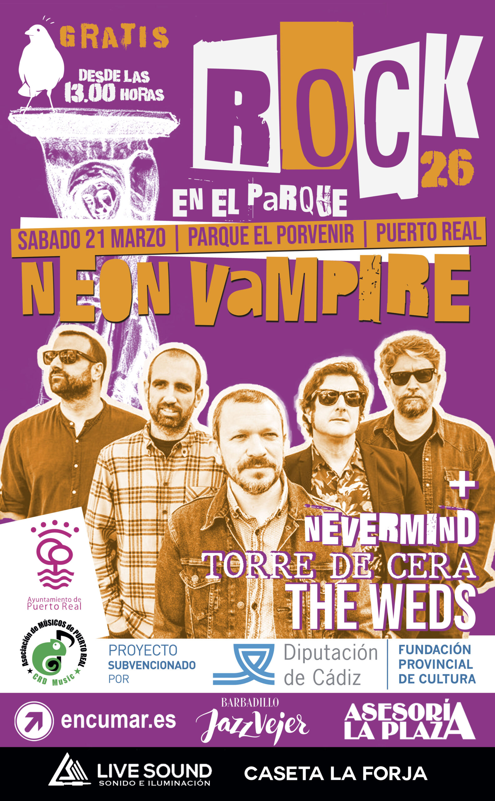 NEON VAMPIRE (Cabeza de cartel): Desde San Fernando llegan para dar un golpe sobre la mesa. Con su sonido contundente y una puesta en escena eléctrica, los isleños cerrarán la jornada demostrando por qué son una de las bandas con más proyección de la Bahía.